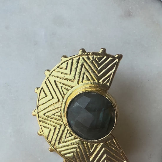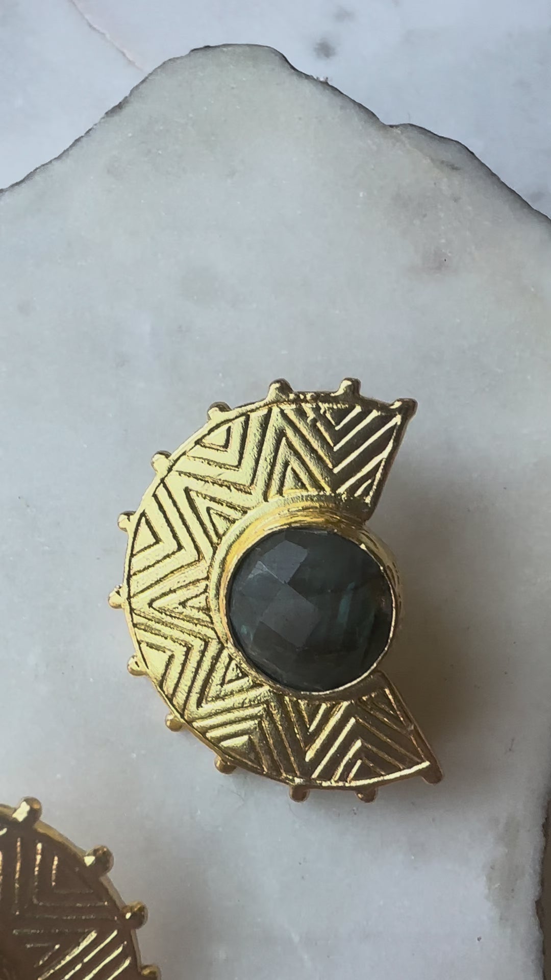 Bold contemporary statement earrings are 21k gold plated half discs with striking sunburst design and ball edging and labradorite center. Pushback closing.