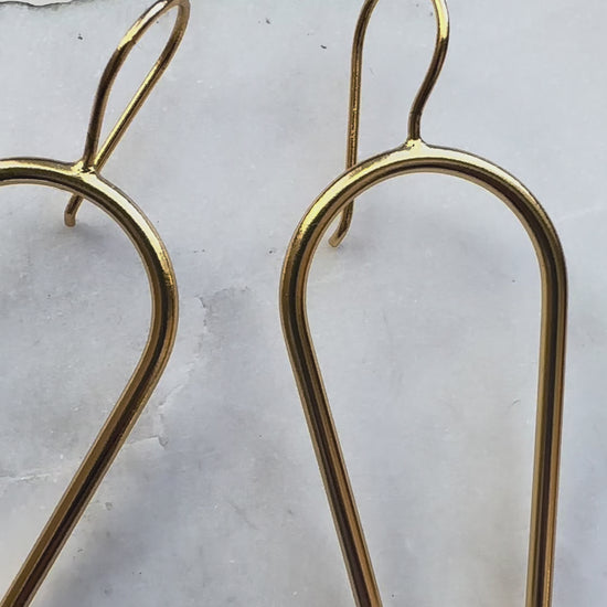 These sculptural 21 karat gold-plated labradorite earrings embody modern minimalism with an artisanal edge. Designed with an elongated open-frame silhouette and finished with a striking faceted labradorite half-moon gemstone, they offer subtle movement and luminous depth from every angle. The clean architectural lines paired with the natural iridescence of labradorite create an effortlessly chic statement—perfect for everyday wear or elevated evening styling. Lightweight yet bold, these earrings transition seamlessly from casual looks to polished ensembles. Waterproof lacquer polish to prevent tarnishing. French wire closing.