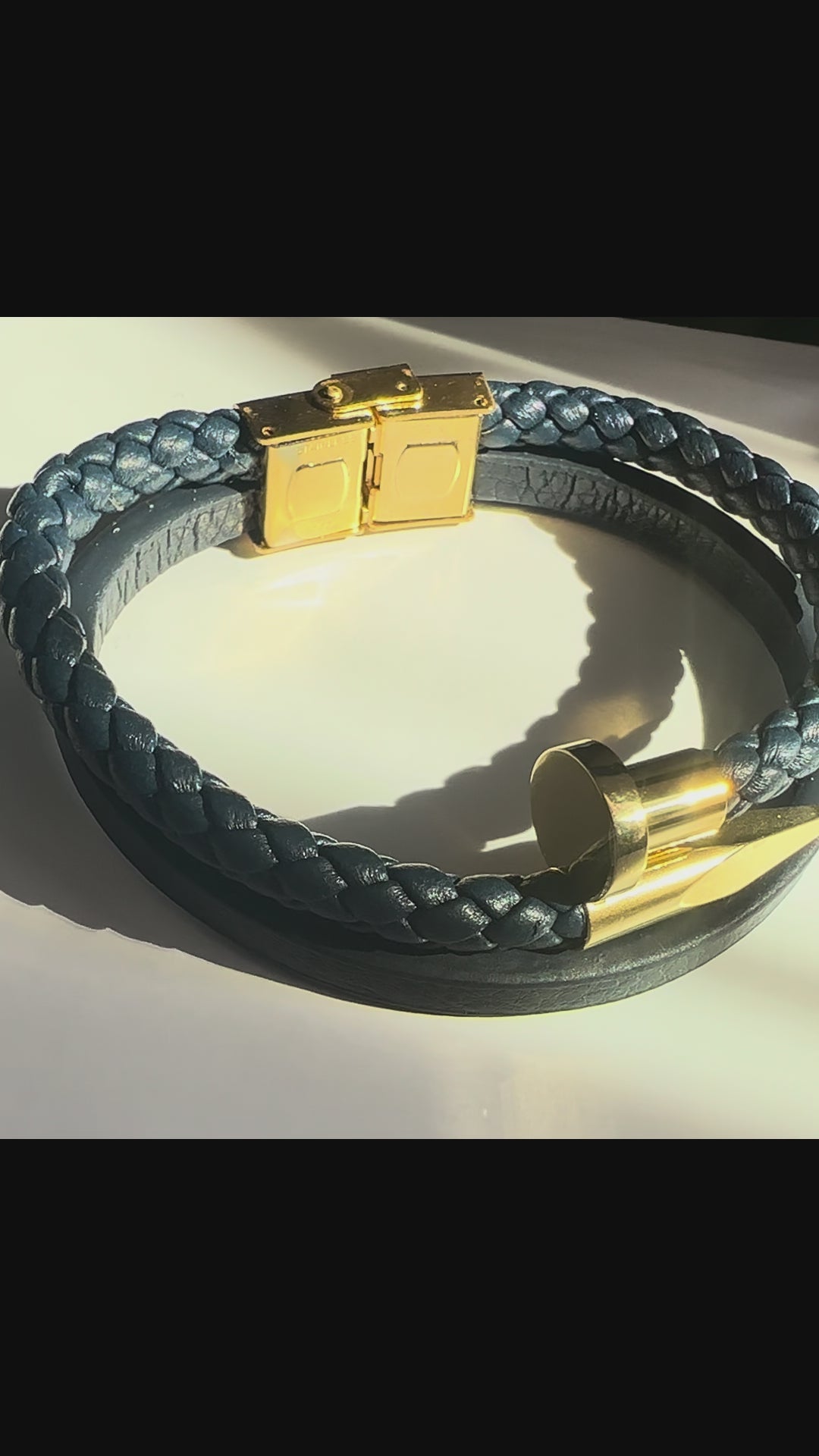 Add a boho-lux industrial edge to your wardrobe with this artisanal men’s woven leather nail cuff wrap bracelet from Bebek Jewels. Handcrafted with premium navy genuine leather and finished with gold stainless steel detailing and clasp, this statement piece balances rugged masculinity with refined sophistication.